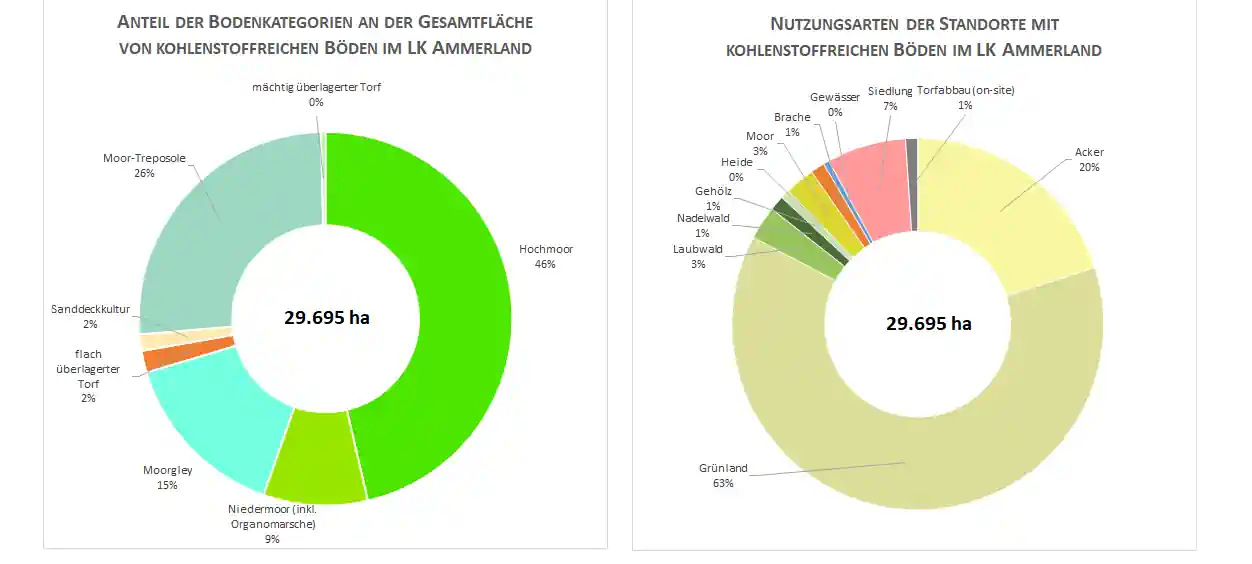 Setzt man die 21% der Moore im Landkreis Ammerland mit 100% gleich, ergeben sich daraus 46% Hochmoore. Knapp 2/3 (63%) der Moore und kohlenstoffreichen Böden wird als Grünland genutzt“. (Quelle MoorIS).