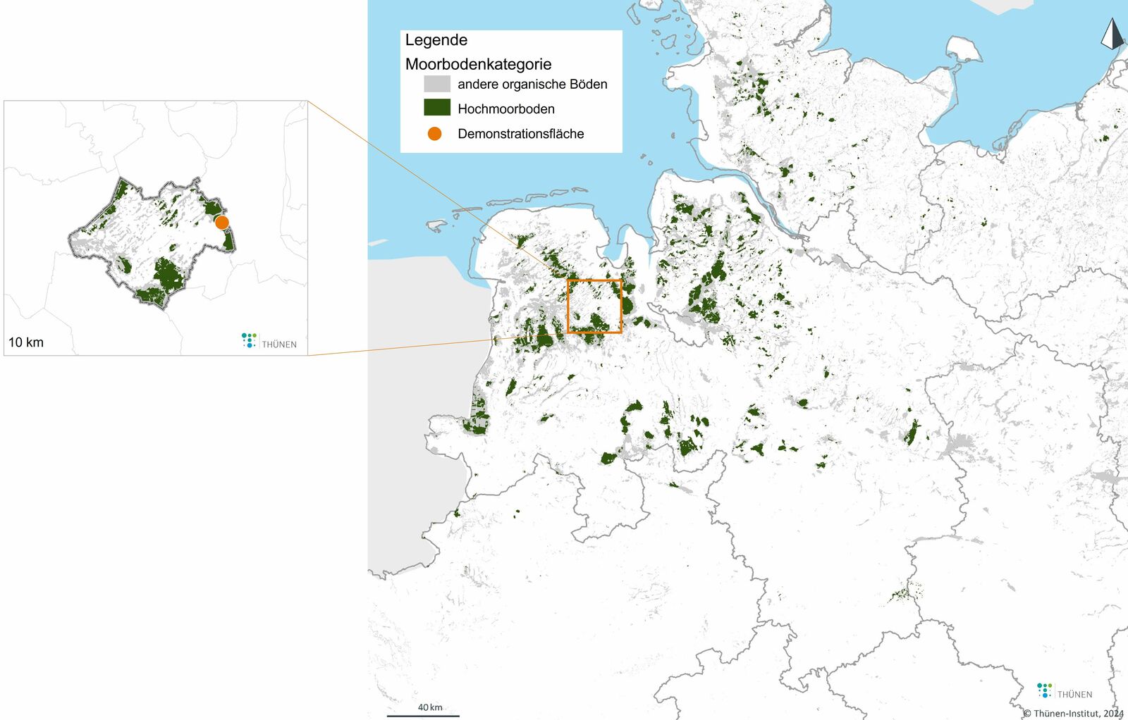 Die Karte zeigt in grün die Hochmoore in Nordwest-Deutschland. Der kleine Ausschnitt zeigt den Landkreis Ammerland und die dortigen Hochmoore.
