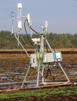 Einen Tag und drei Personen hat der Aufbau gebraucht, natürlich plus viele Vorarbeiten vom Testbetrieb der Geräte im Labor, dem Verlegen von Stromkabeln zum Standort im Gelände oder dem Bau einer einfachen Plattform aus Brettern. Allein der Aufbau des Tripods dauerte vier Stunden. Anschließend wurden Stromkästen und Datenlogger am Turm befestigt, die für die Kommunikation der Instrumente untereinander verantwortlich sind. Dazu zählen CO₂- und Methan-Sensoren, Kamera, Ultraschall-Anemometer und Router, der die Daten nach außen überträgt. Jedes Instrument verfügt über eine eigene IP-Adresse für den Remote-Zugriff. Dieser ermöglicht nicht nur das Abrufen, sondern auch das Steuern der Instrumente – eine Besonderheit dieses Eddy-Turms, die über den Standard hinausgeht. Am Folgetag war nur noch etwas Feintuning nötig, um Winkel, Abstände und Ausrichtung der Sensoren optimal einzustellen. Jetzt funkt der „Eddy“ und erste Auswertungen erwarten die Wissenschaftler*innen in ungefähr einem Monat.